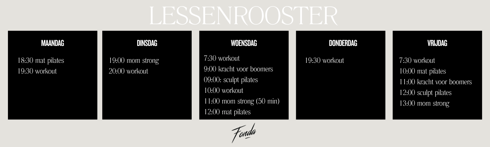 We schakelen op dit moment over naar een nieuw boekingssysteem. Wil jij nog voor 1 april starten? Stuur dan een mailtje naar hello@fitbyfonda.be en dan boeken we je handmatig in.